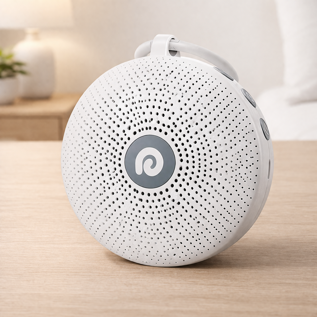 Compact sound machine featuring white noise and nature sounds designed to mask background noise and help create a calm sleep environment.